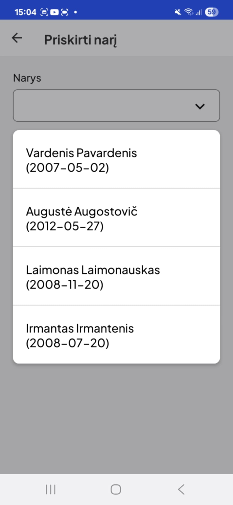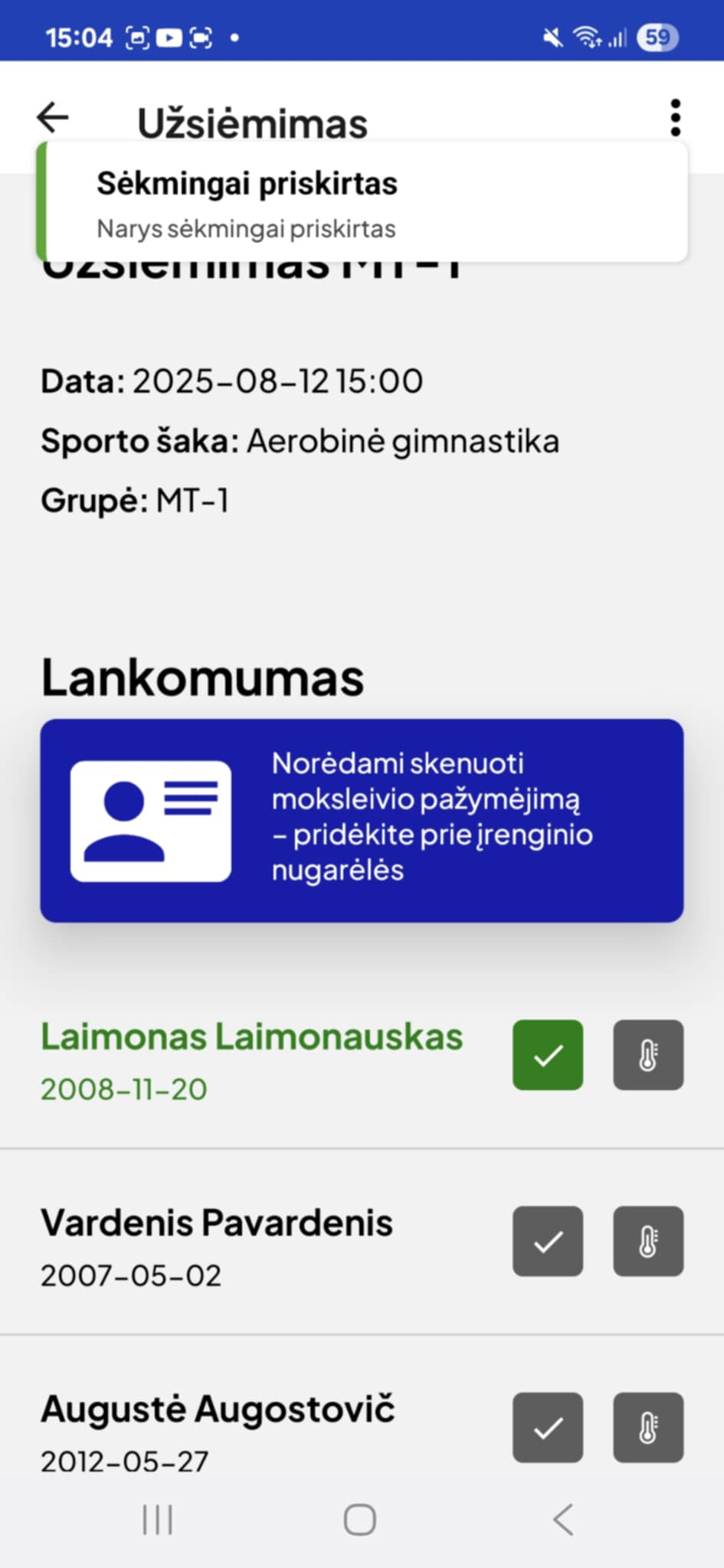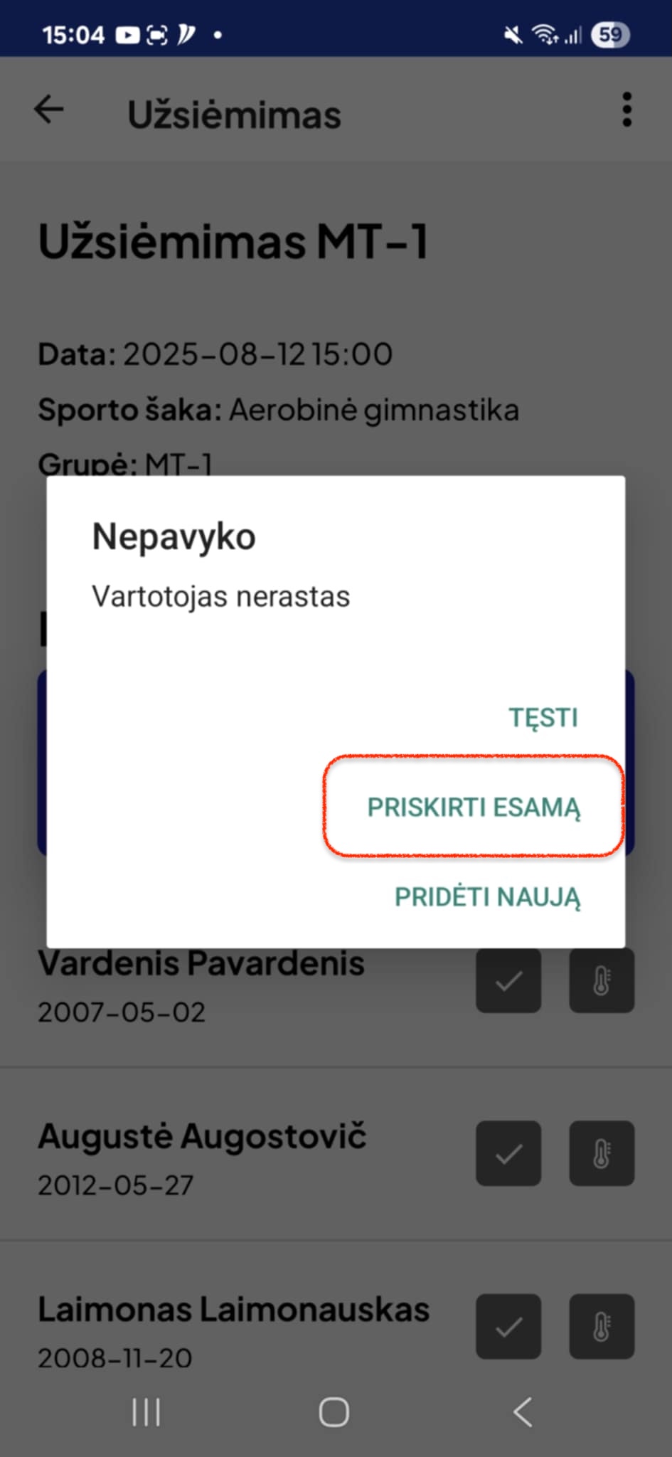 Kartais nutinka, kad moksleivio kortelė nėra identifikuojama, arba ji naujai pagaminta ir apie ją duomenų dar nėra. Tokiu atveju jums per android app "Sportas Klaipėda" nuskaičius NFC, turėtų išmesti pranešimą ir pasiūlyti kortelę priskirti esamam iš sąrašo. Spauskite "Priskirti esamą"